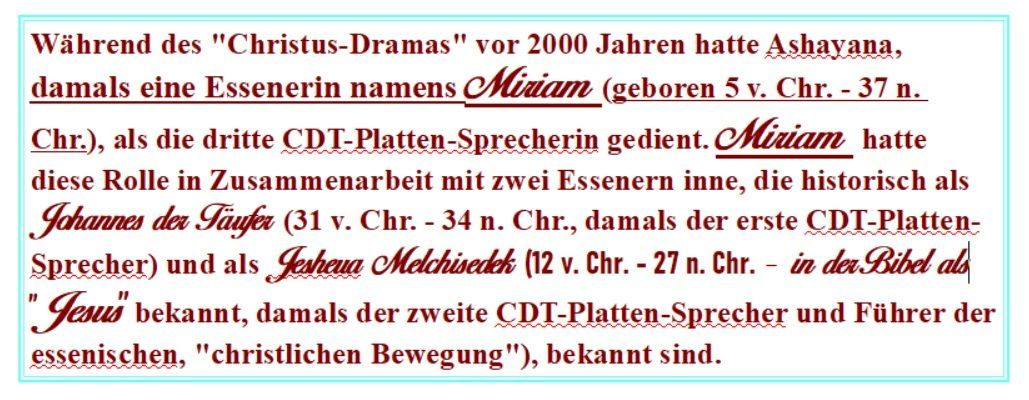 Vor ihrem CDT-Plattensprecher-Vertrag als die Essenerin Miriam - zusammen mit anderen, die aus dem Eieyani-Kollektiv inkarniert waren -, hatte Ashayana während der frühen lemurianischen, atlantischen, hinduistischen, keltisch-druidischen und ägyptischen, historischen Perioden zahlreiche Male als CDT-Platten-Sprecherin und Eieyani-Priesterin gedient.